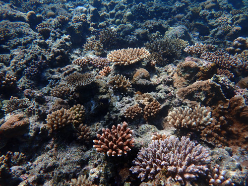 この写真は先日撮ったもの。大崎の浅瀬です。数年前の白化でほぼ壊滅状態になったのですが、新しいサンゴが育っています。このサンゴたちは昨年も白化し掛けたのですが、何とか持ち堪えました。
