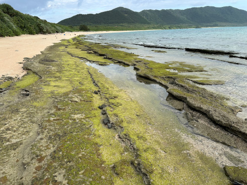 ビーチロックは炭酸カルシウムの膠結作用により、海浜堆積物が膠結されてできる、板状の石灰質の砂礫岩で、サンゴ礁のある砂浜にできることが多い。以前は無かった。