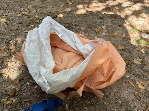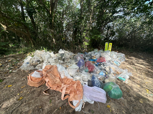 男子5人で3時間回収作業した結果、トン袋13個分でした。でも、今日回収作業したエリアのゴミの数%だと思う。明日もここで回収作業です。
