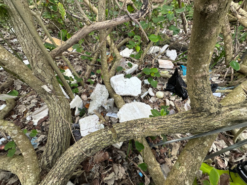 茂みの中には発泡スチロールがびっしりです。堆積していて、地面が見えない場所もあります。大きい物はもちろん回収しますが、細かく砕けた物は拾っても拾っても・・・手に負えない(T_T)
