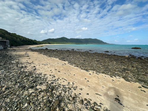 10年前と比べると、ビーチがとんでもなく狭くなっていたことです。以前は少なくても下の写真の右真ん中の海の中にある岩までサンゴのバラス砂が広がっていたと思う。そのバラスが激減し、礫が剝き出しになっている。