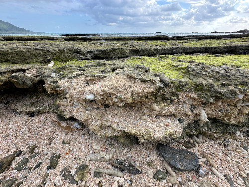 ビーチロックの断面 砂礫が固まっているのが良く分かる⤴