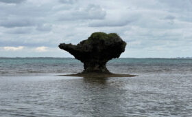 明石の集落とビーチの間には植物帯があります。ビーチに接している所にはモンパノ木、アダン、そしてハスノハギリの群落があって集落へ。モンパノ木は低く枝葉がドーム状になるのでその中にゴミが引っ掛かり取りだし難い。ハスノハギリ地帯は湿度が高くて蚊がいるけど、雨風日射を防いでくれる防風林地帯だが、そこにもゴミが散乱している。とにかくゴミが無い場所はない。