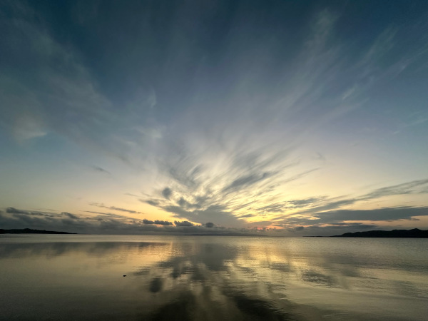 名蔵湾の夕焼けは毎日違います。私は夕陽より日没後の景色の方が好きです。