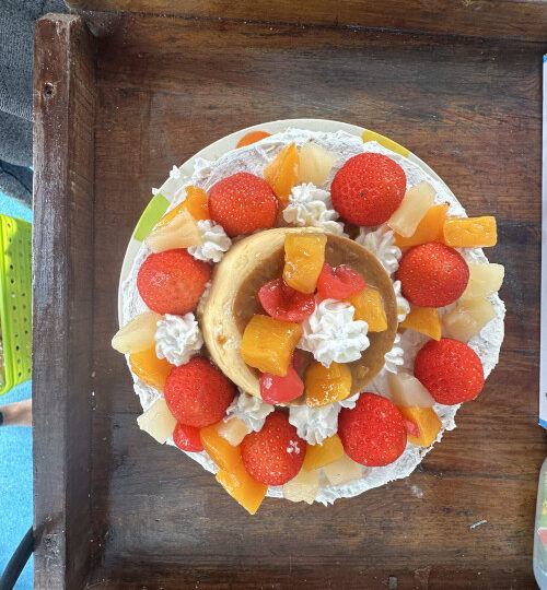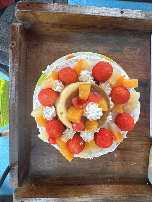 生クリームもりもりで真ん中にプリンど~ん!イチゴと缶詰フルーツをのせて(^^♪